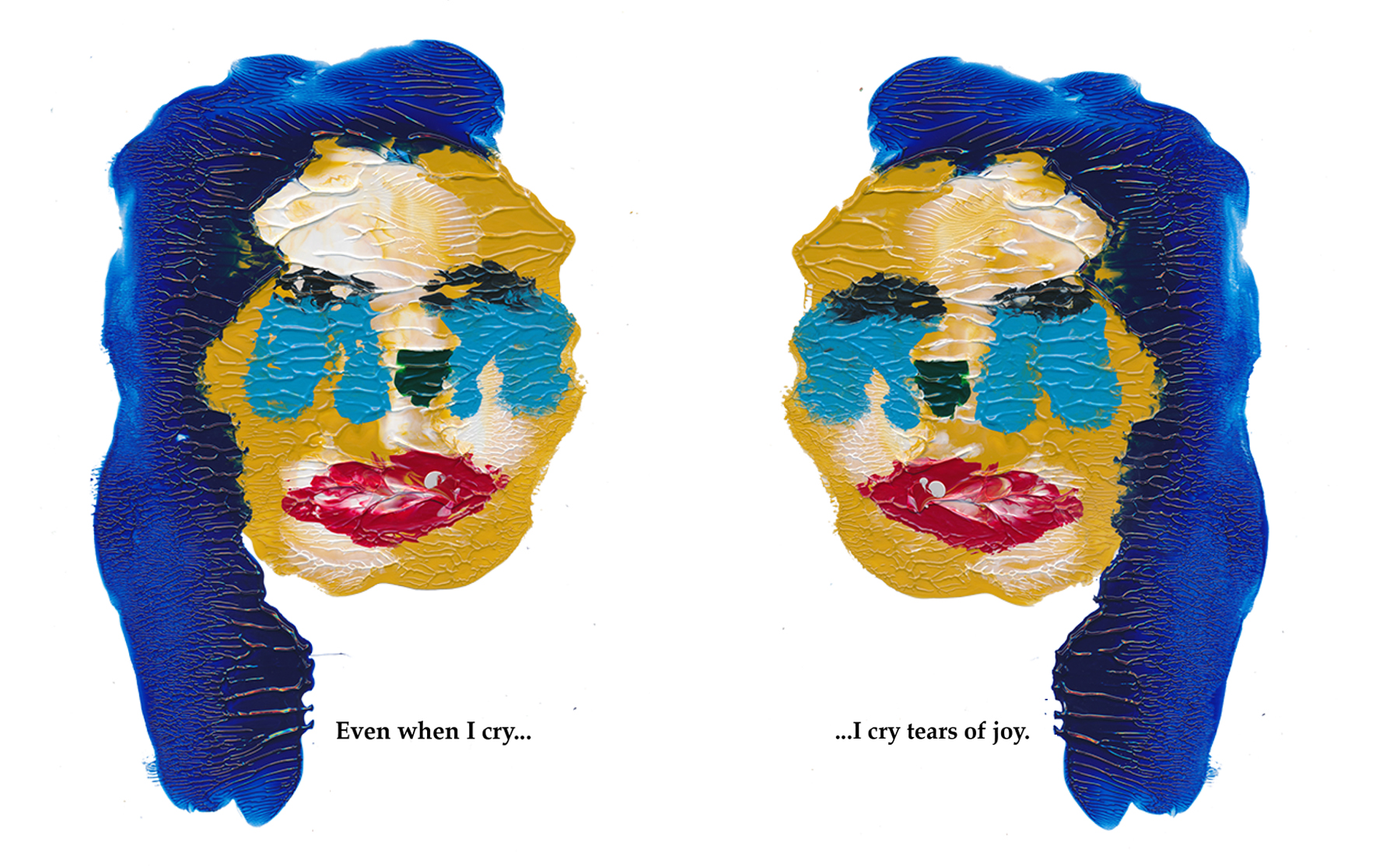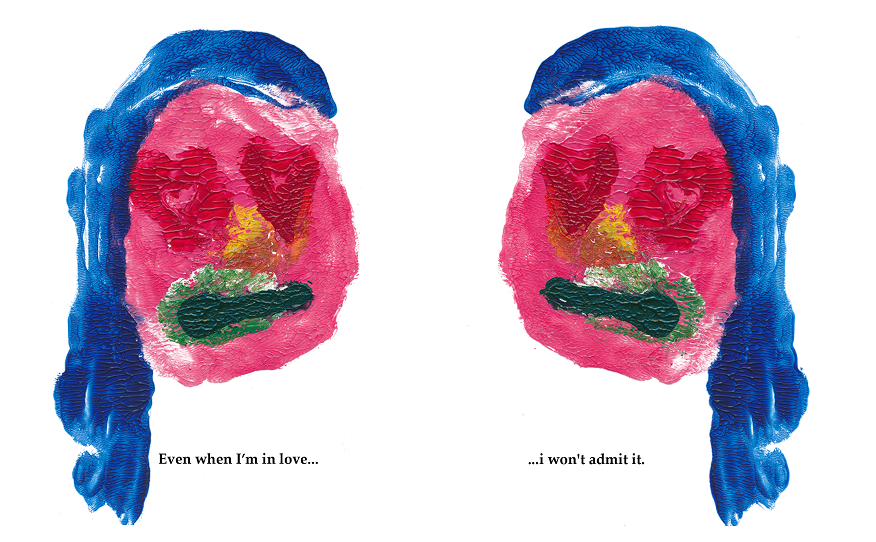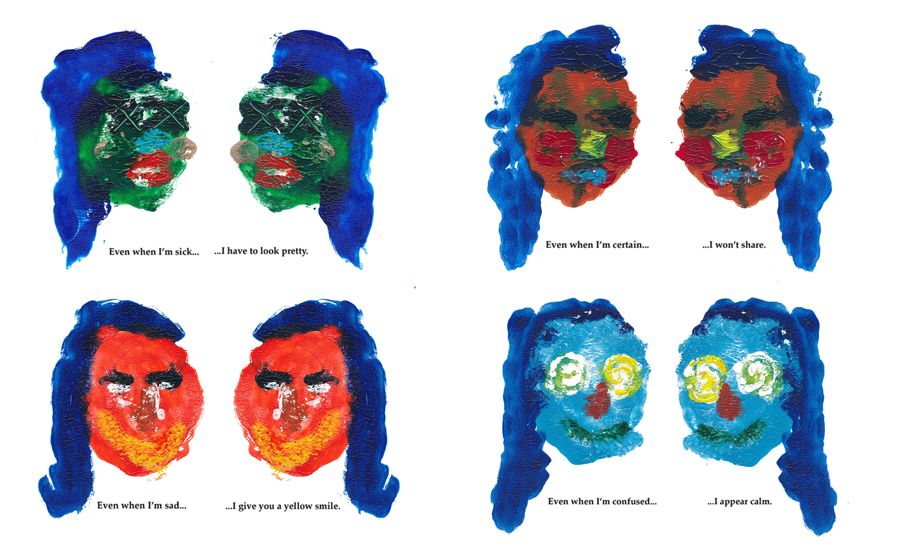 Through spontaneous experimentation with acrylic on acetate, a faceless character emerges—reproduced multiple times, each instance paired with a phrase that contrasts a true feeling with a false one. This contradiction, reflected in both the character’s representation and the accompanying text, exposes the fragility and insecurities often concealed behind a mask of deception.
