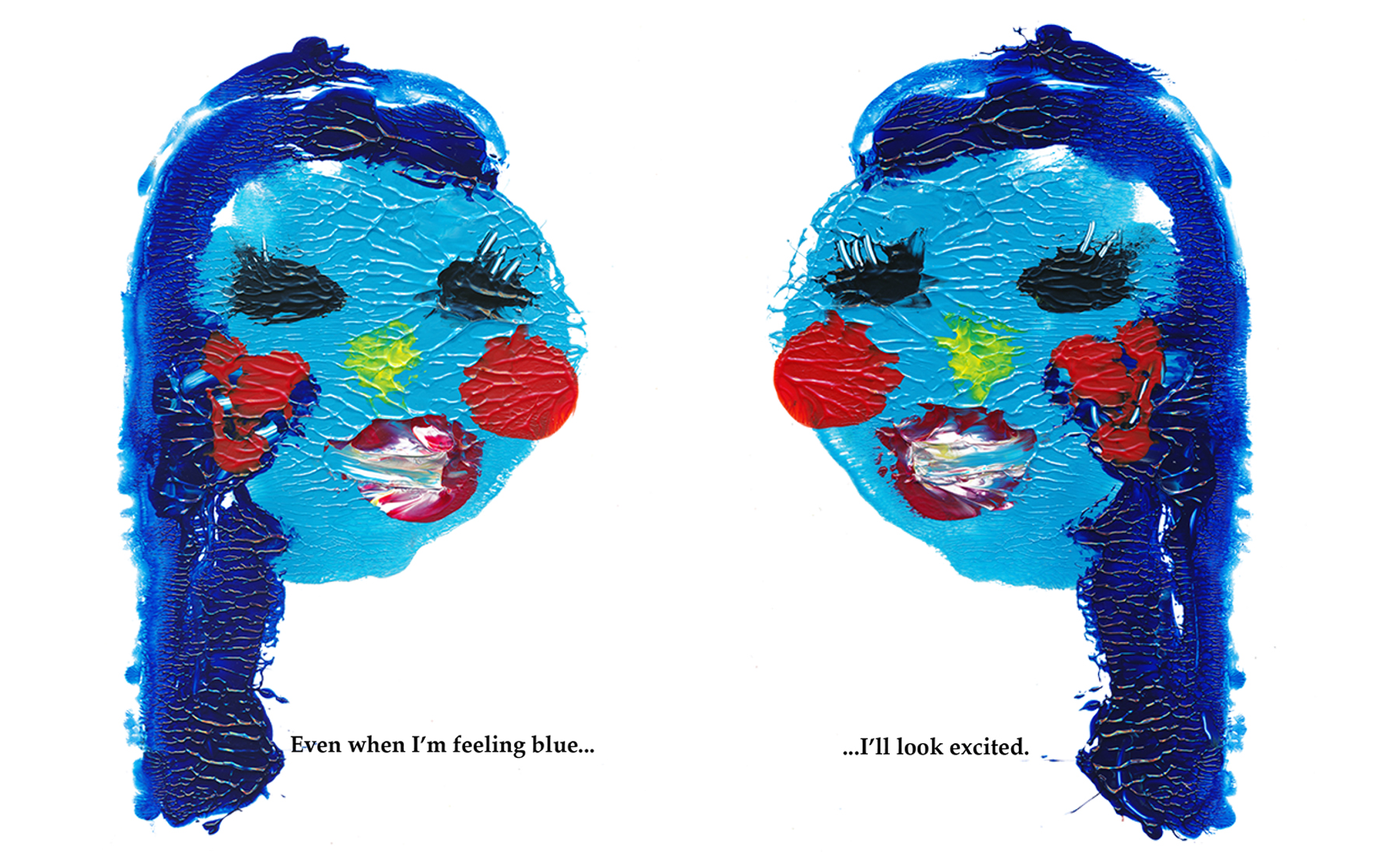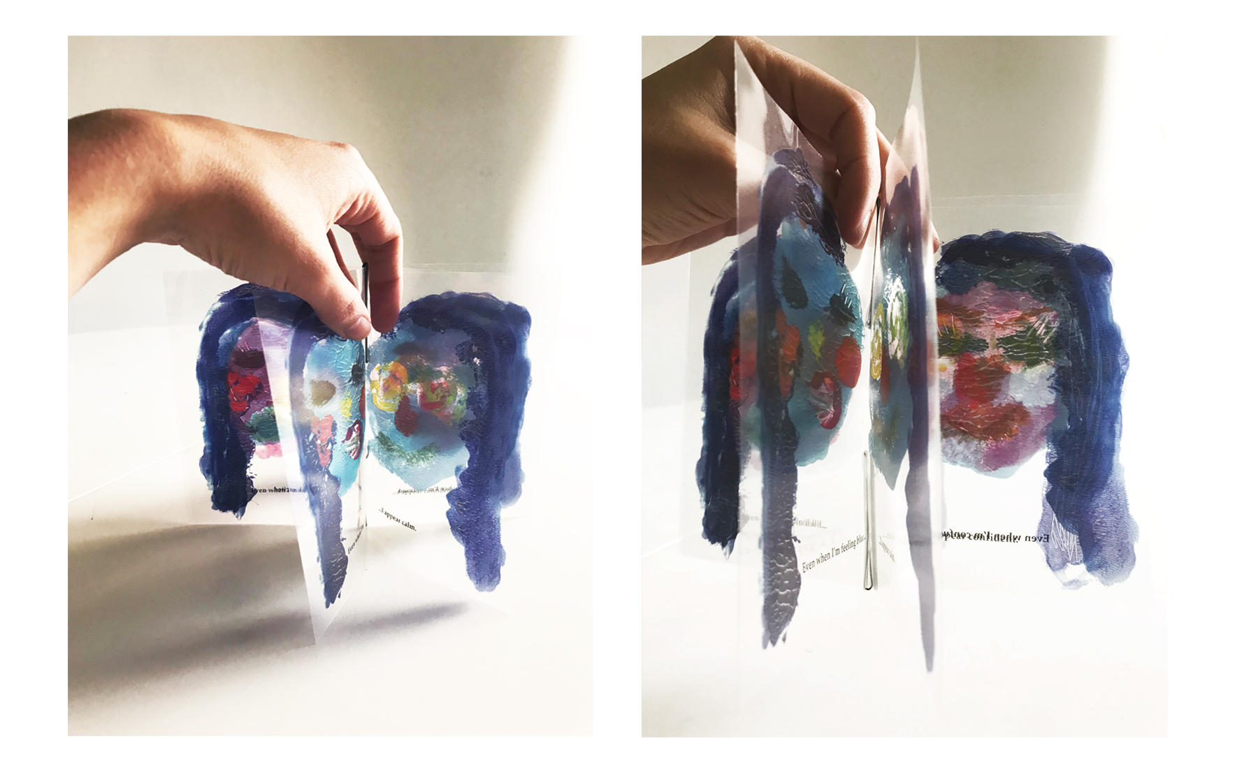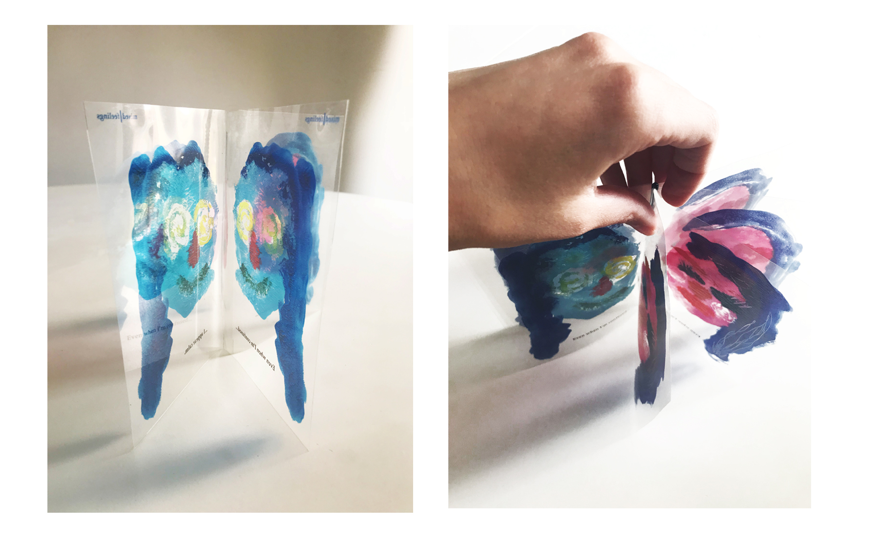 The final outcome is an interactive object that allows for manipulation, enabling different emotional states to be expressed by changing the position of the acetate layers. This interactivity between illustrations and text reinforces the project’s title, Mixed Feelings.